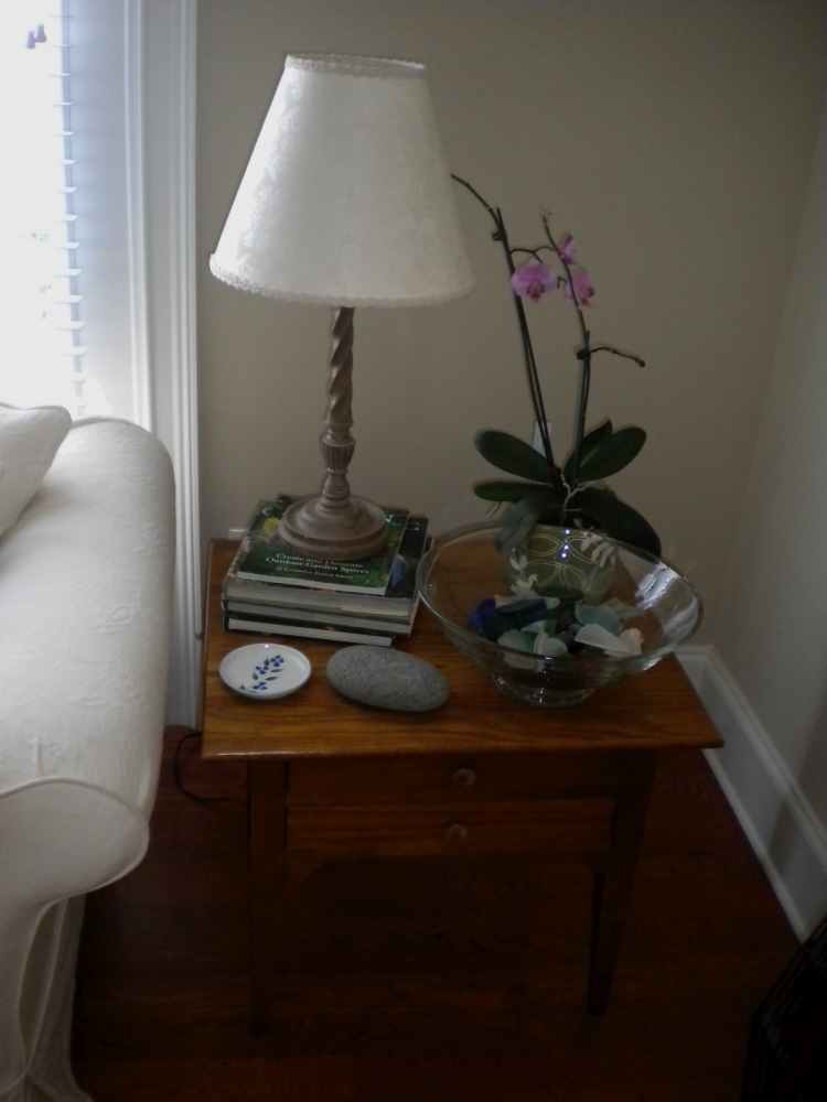 This is the shaker style end table I had in the garage. I put the orchid Megan and Ken gave me for Mother's Day last year on it, the lovely oval smooth rock from Maine, my huge glass bowl of my beach glass collection and a stick lamp I already had with some books and my blueberry pottery coaster from Maine. I think it looks perfect!